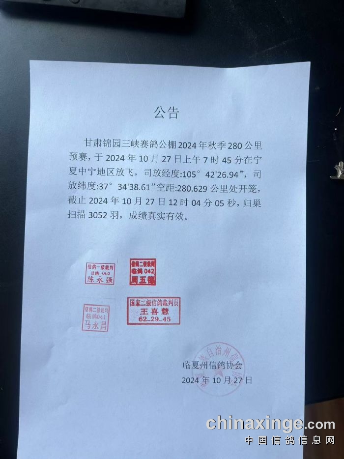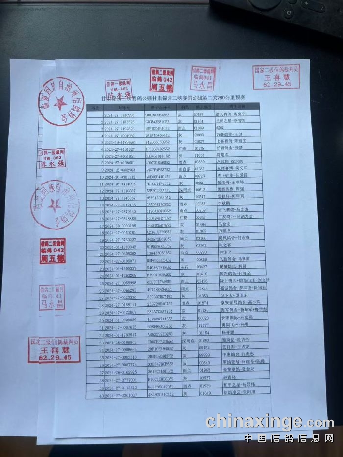 甘肃锦园三峡赛鸽公棚280公里预赛关赛奖金(裁判盖章图)