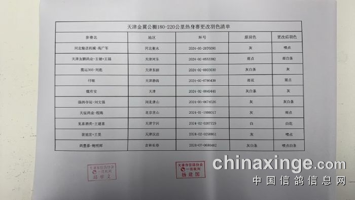 天津金翼公棚180-220公里热身赛更改羽色清单