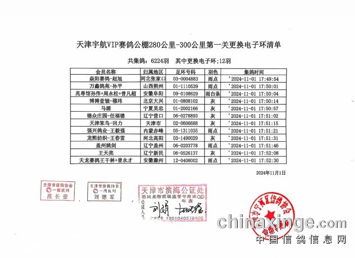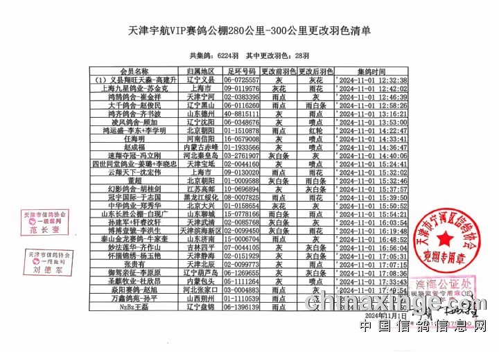 天津宇航VIP赛鸽公棚280-300公里更换电子环及更改羽色清单