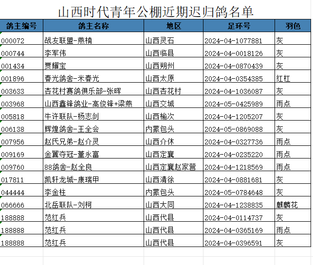 山西时代青年公棚500-530km彩鸽奖获奖明细(请您仔细核对)