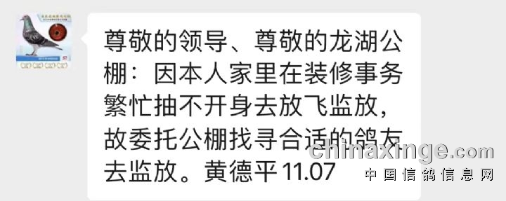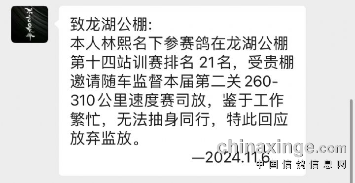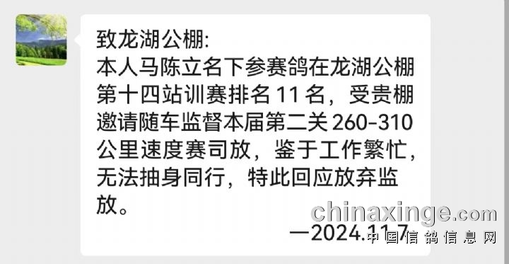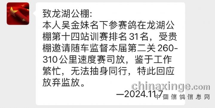 第11名21名31名41名的鸽友由于个人原因无法参与本次热身赛的监放!