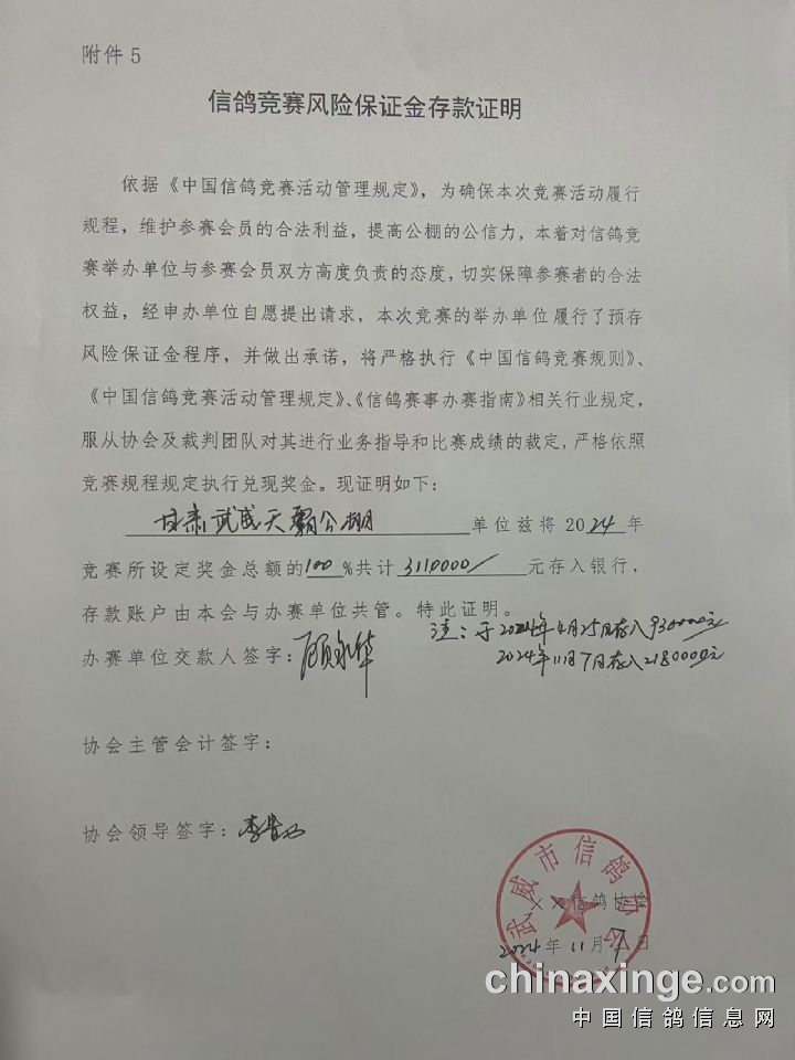 甘肃天霸赛鸽公棚全额保证金已存入三方共管账户