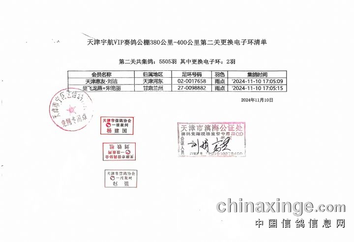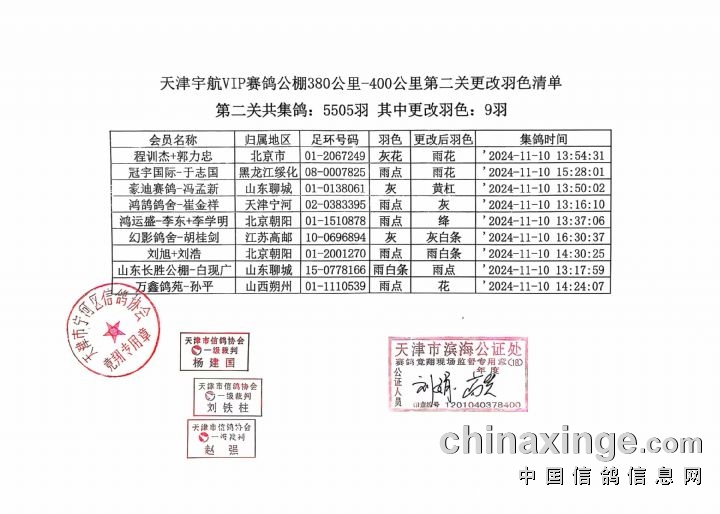 天津宇航VIP赛鸽公棚380-400公里第二关更换电子环及更改羽色清单