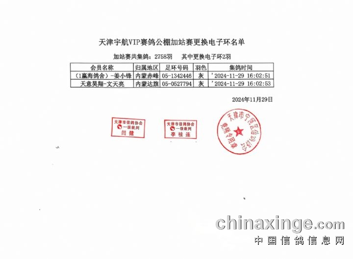 天津宇航VIP赛鸽公棚加站赛更换电子环名单