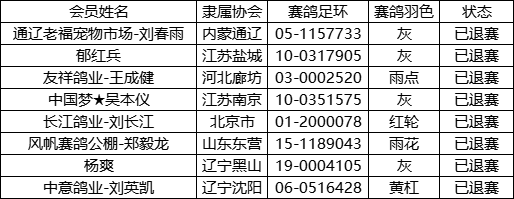 天津宇航VIP大棚收费站归巢受伤鸽名单