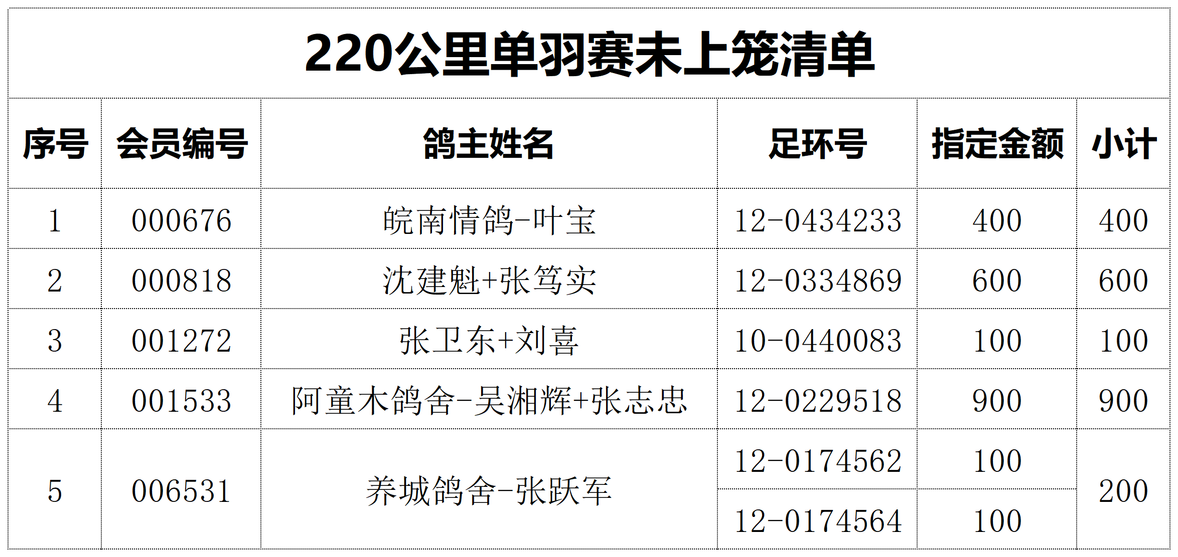 安徽百诚赛鸽中心:220公里单羽赛未上笼退费清单