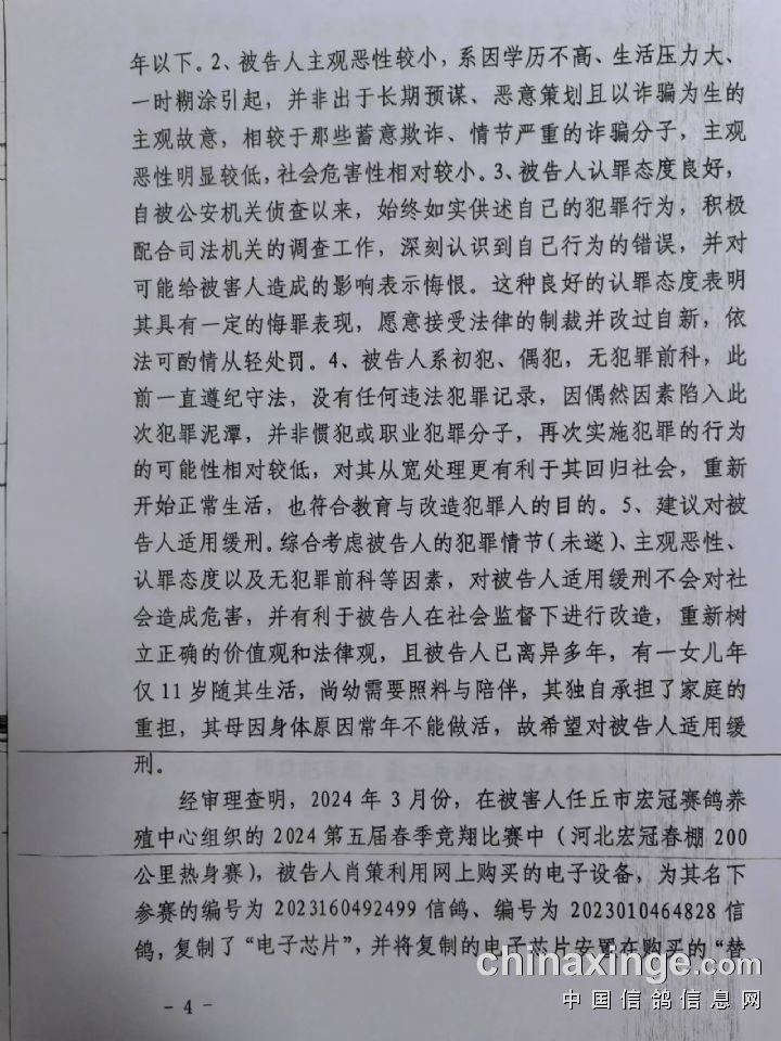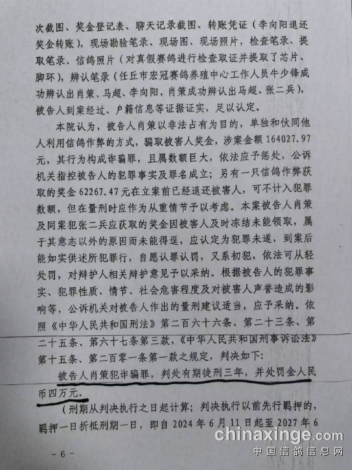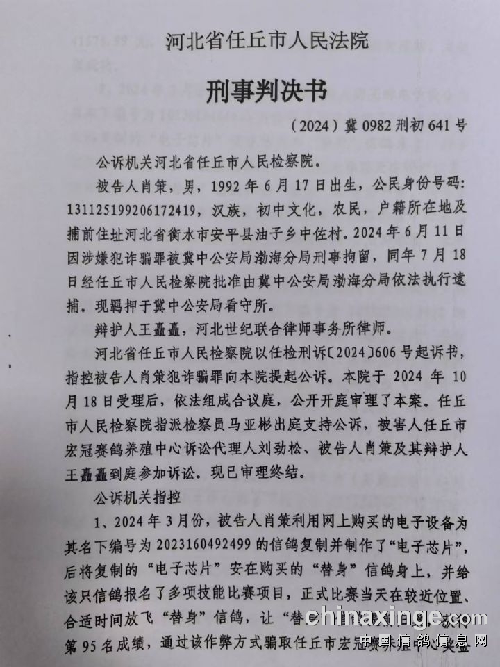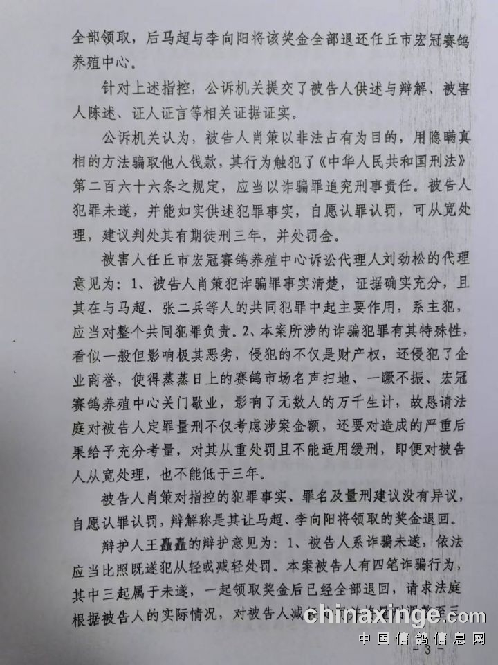 | 经过近九个月的侦查、抓捕、起诉,11月21日河北省任丘市人民法院公开审理了河北宏冠公棚今春200公里鸽友舞弊案,法庭上经多方辩论,该案事实清楚,证据确凿,构成诈骗罪;11月29日任丘市人民法院依法判处该案主要犯罪分子肖策有期徒刑3年,并处罚金4万元!其他涉案罪犯将依次开庭审理!