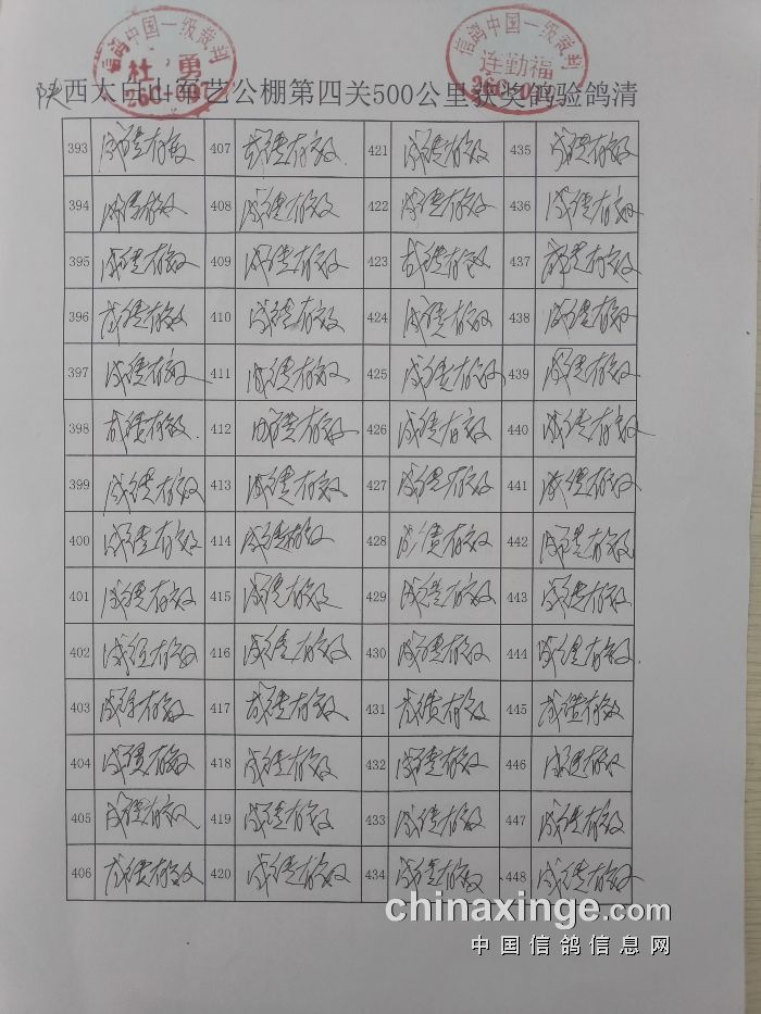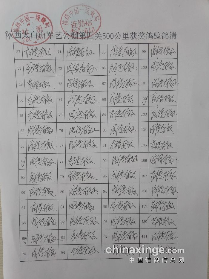 陕西太白山军艺公棚第四关决赛前500名获奖鸽验鸽清单