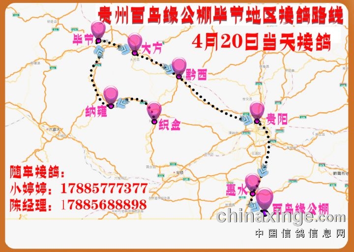 尊敬的各位会员: 我中心接鸽专车将于4月20日早从织金出发,经织金、纳雍、毕节、大方、黔西等地区收鸽——这是今年最后一次毕节地区专车接鸽,有适龄幼鸽补交参赛的会员,请提前交与当地代理人或联系收鸽人员。