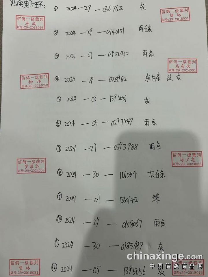 宁夏赛航赛鸽公棚101公里收费站更换电子环名单及更改羽色