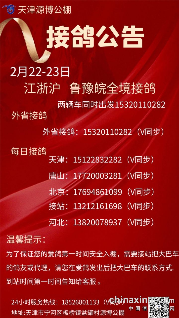 天津源博公棚2月22日前往江浙沪、鲁豫皖地区接鸽公告