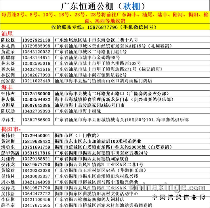 (线路二)前往广东海丰、汕尾、陆丰、陆河、揭西、棉湖、揭阳等地收鸽 专线联系:15876877796;