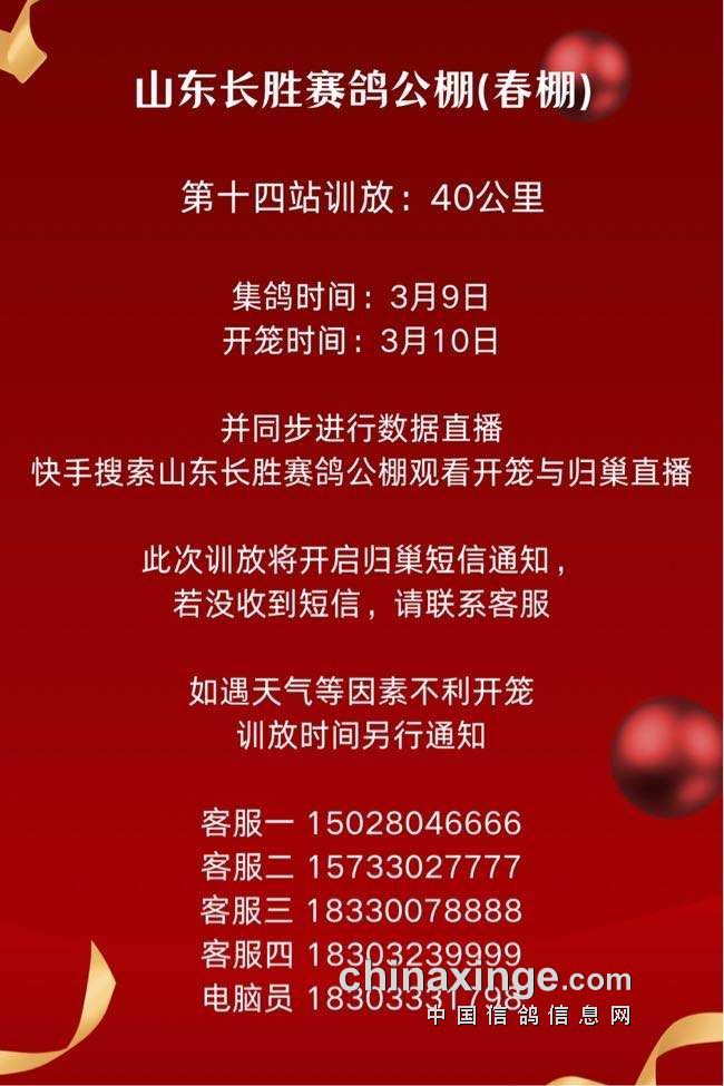 山东长胜赛鸽公棚第十四站(40公里)训放公告