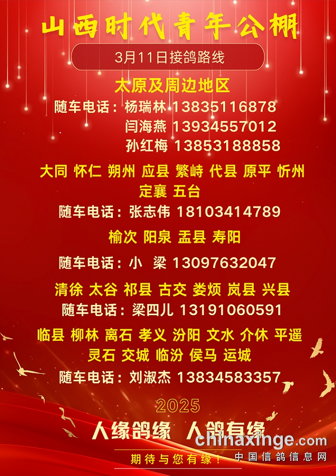山西时代青年公棚3月11日接鸽路线