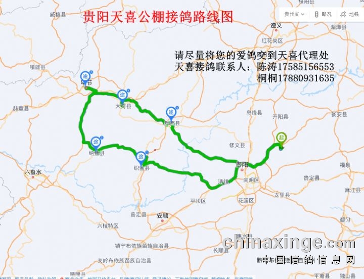 贵阳天喜赛鸽中心将于6月1日(星期天)到黔大毕等地现场收鸽,路线:织金→纳雍→朱昌→毕节→大方→黔西→沙窝沿途有需要交鸽的鸽友请提前预约,请尽量将您的爱鸽交到天喜代理点处。祝鸽友们鸽运亨通!
