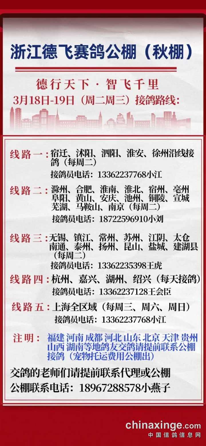 浙江德飞赛鸽公棚(秋棚)接鸽公告(3月18~19日)