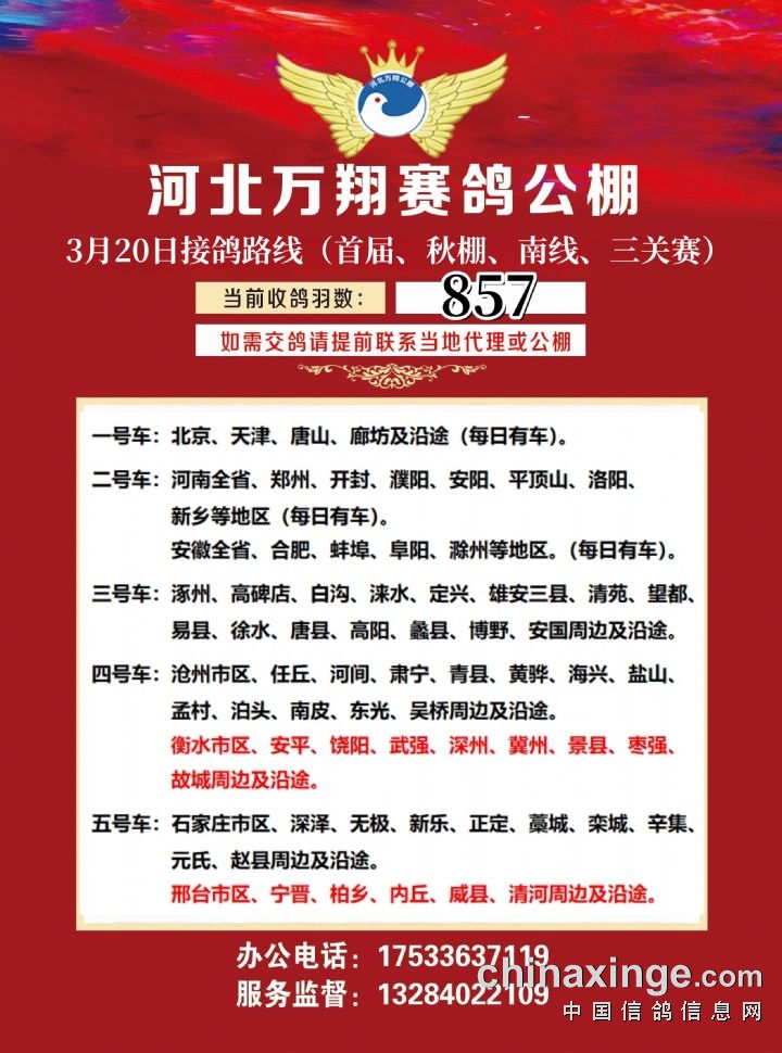 河北万翔公棚:3月20日接鸽路线