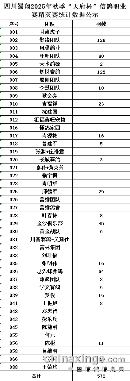 经过三日的公示期,根据各团队核实各自指定明细的结果,现将2025年秋季四关精英赛明细最终统计结果予以公示。本次精英赛参赛计1052羽(售环自带精英赛482羽加精英赛报名572),共录取31.87个名额,各团队(参赛者)指定数量详见下表(不含0和1号)。另,根据职业赛的特征及国内职业赛鸽俱乐部的通行惯例,并考虑参赛鸽友的根本利益,本俱乐部不在网上公布具体每只参赛选手的参赛明细以防止网鸽勒索等不正当行为!