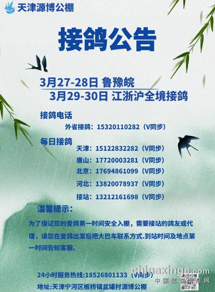 天津源博公棚3月27日-28日前往鲁豫皖,3月29日-30日江浙沪全境接鸽公告