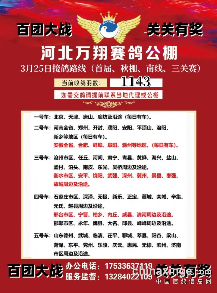 河北万翔公棚:3月25日接鸽路线