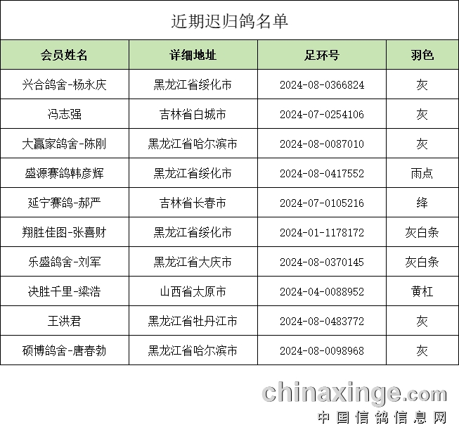 黑龙江伟路国际赛鸽公棚(秋棚)近期迟归鸽名单