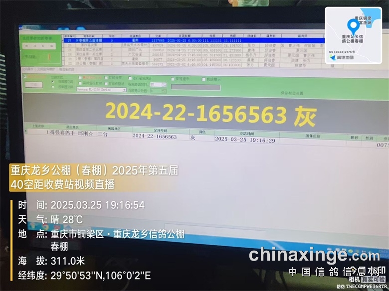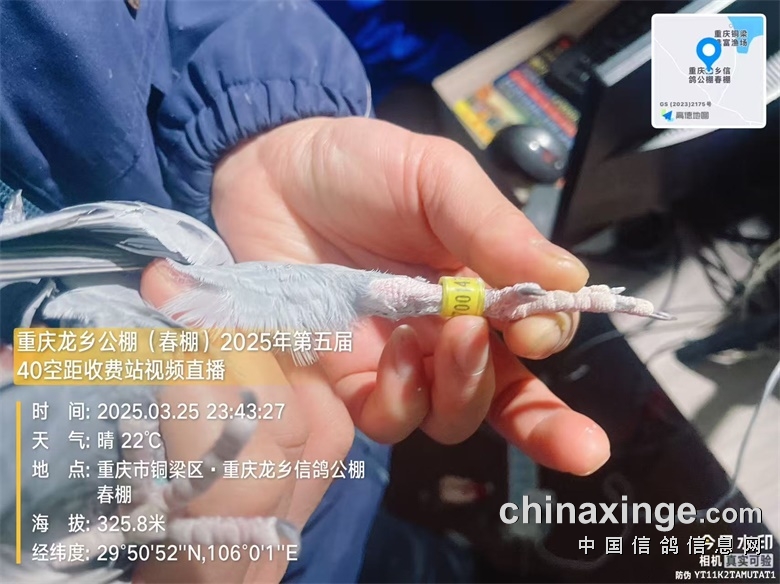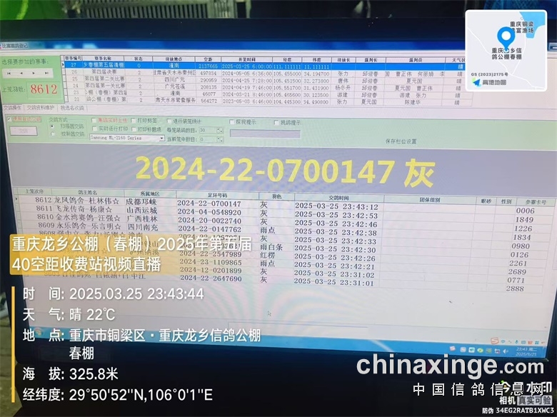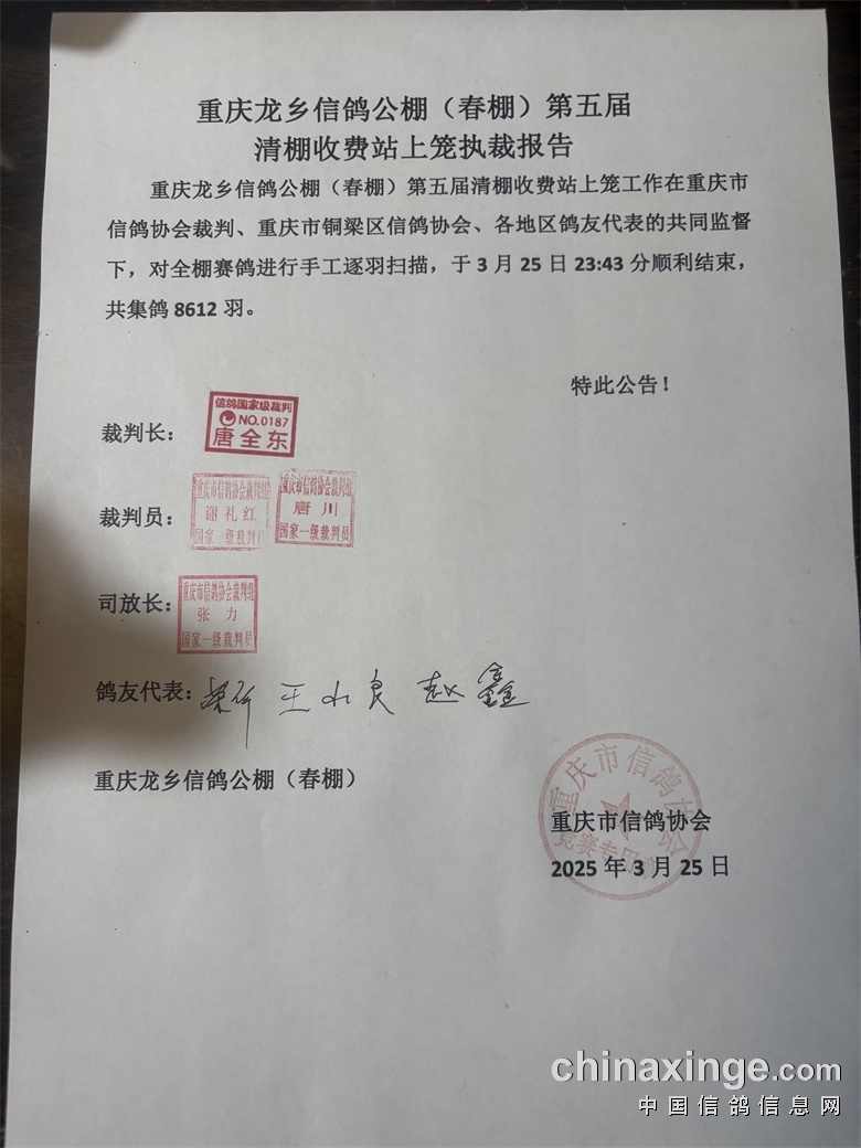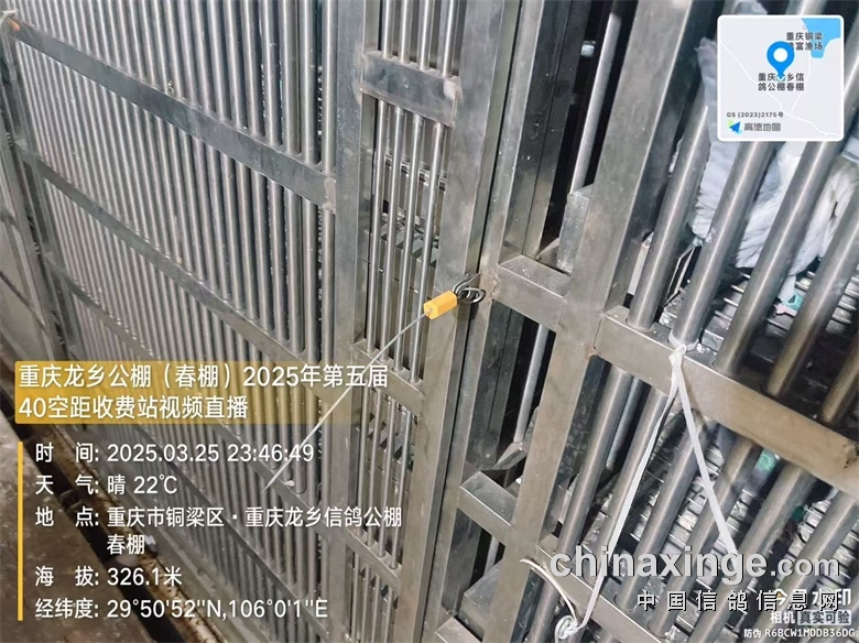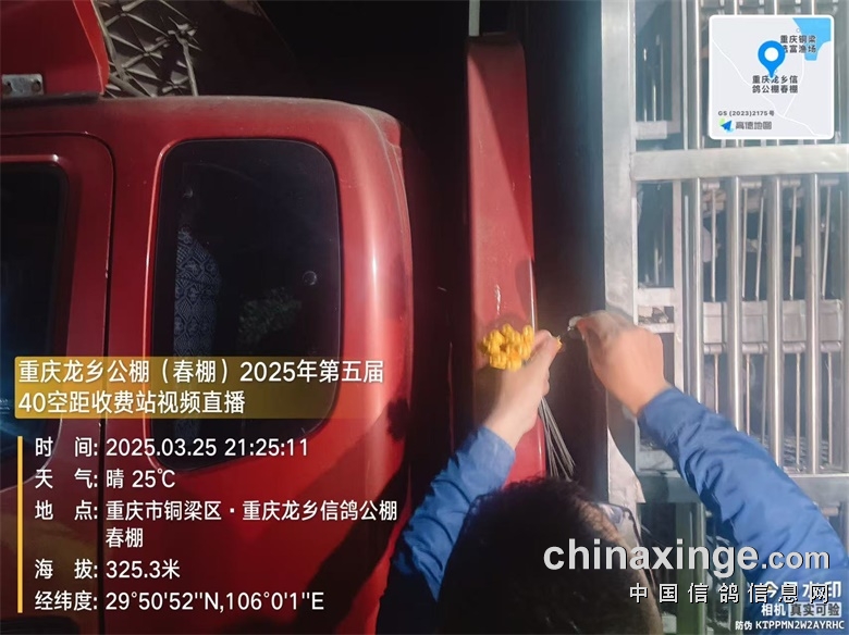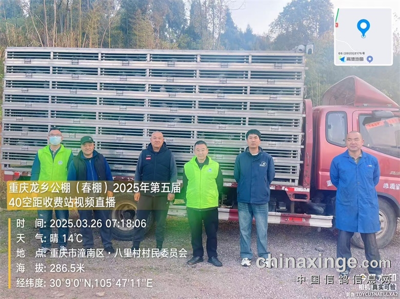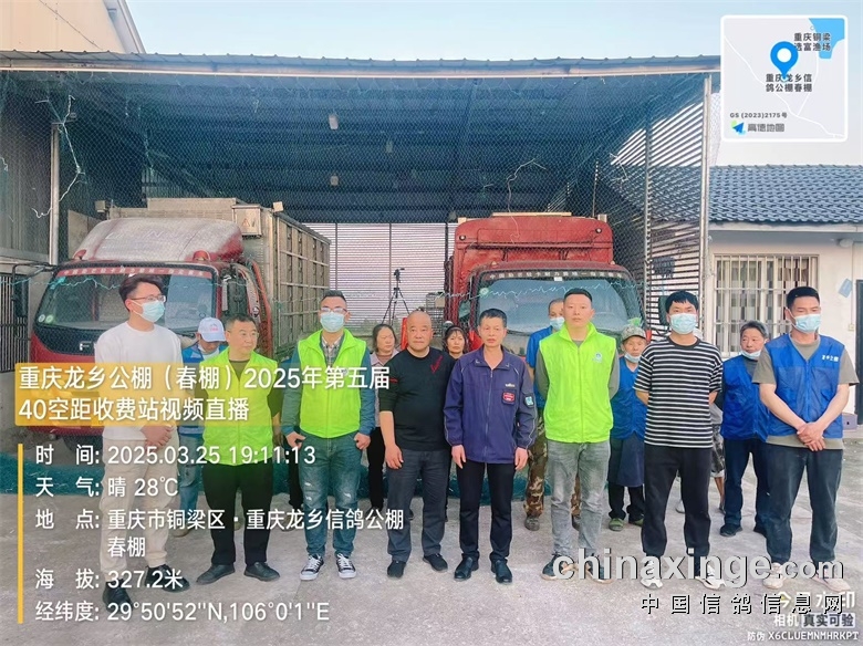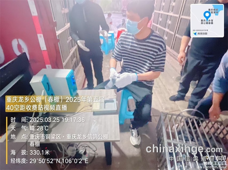 重庆龙乡信鸽公棚(春棚)2025年第五届40空距(收费站)在全国鸽友的大力支持和关怀下,重庆市信鸽协会、监赛单位及鸽友代表监督下进行逐羽扫描装笼,于2025年3月25日晚19:16分开始集鸽,3月25日23:43分结束集鸽工作,共集鸽8612羽。 赛-鸽-天-堂网对本次比赛全程进行网络直播!