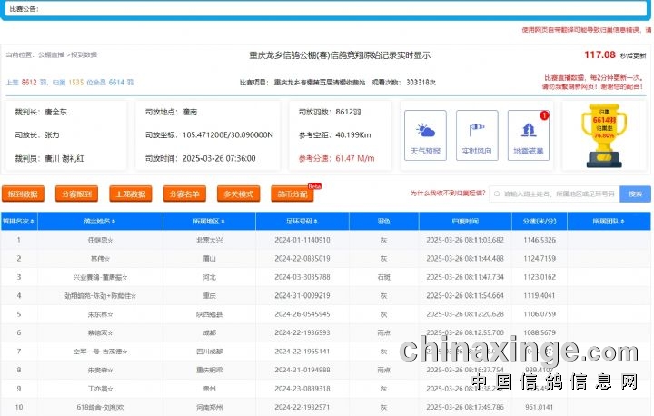 截止25年3月26日18:30分发稿前,赛鸽归巢6614羽,归巢率76.8%。预祝重庆龙乡信鸽公棚(春棚)第五届收费站取得圆满成功!