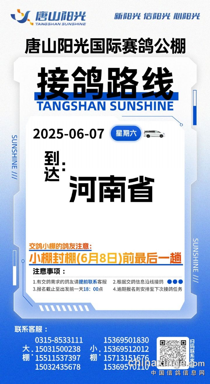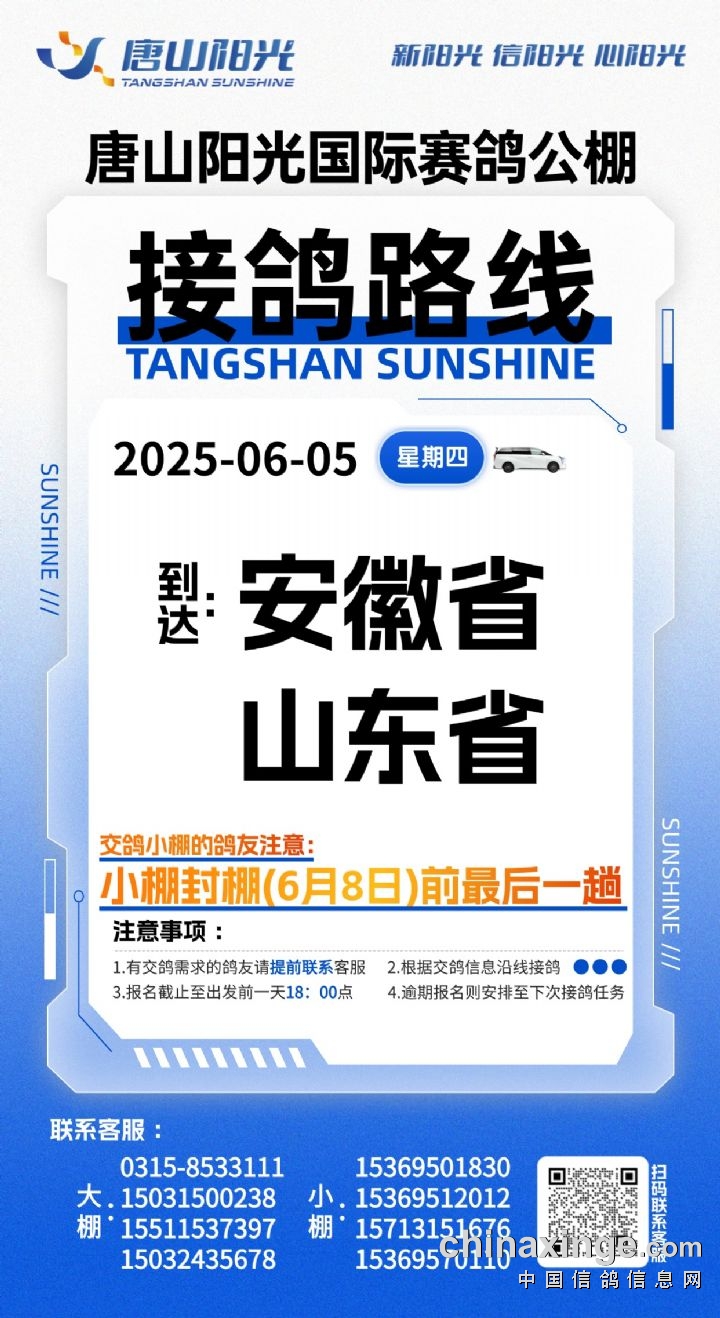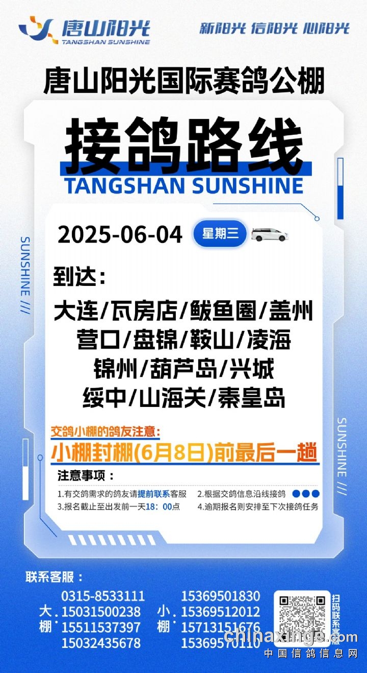 尊敬的会员您好,唐山阳光公棚近期接鸽路线安排:6月4日大连/瓦房店/鲅鱼圈/盖州/营口/盘锦/鞍山/凌海/锦州/葫芦岛/兴城/绥中/山海关/秦皇岛,6月5日安徽省、山东省,6月6日江、浙、沪地区,6月7日河南省全境上门接鸽,如需交鸽请您提前联系客服!