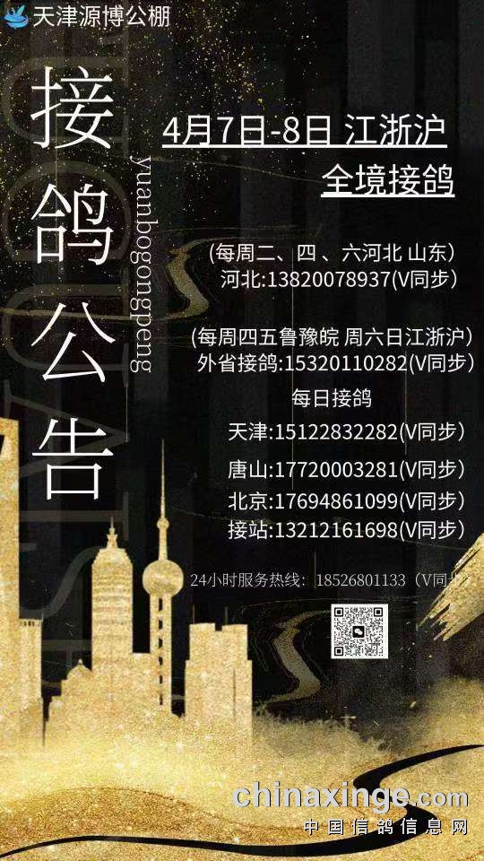 天津源博公棚4月7日-8日前往江浙沪全境接鸽公告