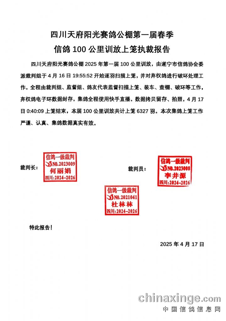 四川天府阳光赛鸽公棚2025年春季首届100公里训放集鸽工作自2025年4月16日19:55在遂宁市信鸽协会裁判组及鸽友代表的监督下开始逐羽扫描集鸽,并对弃权鸽进行破环处理,于4月17日0:40顺利结束,共集鸽6327羽。