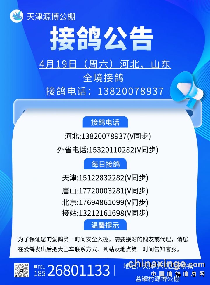 天津源博公棚3月4日河北、山东全境接鸽公告