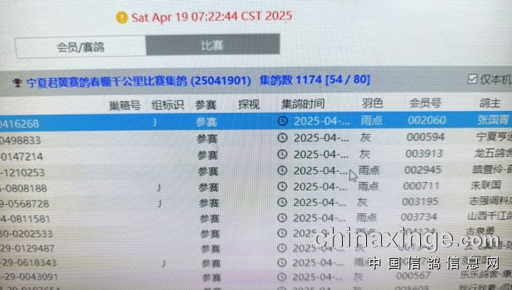 宁夏君翼赛鸽公棚(春棚)12月10日1公里训放成绩直播