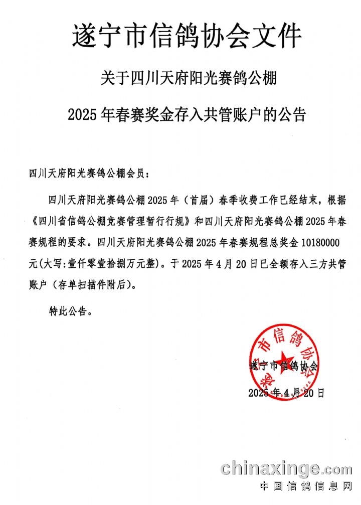 四川天府阳光赛鸽公棚2025年春赛奖金存入共管账户公告