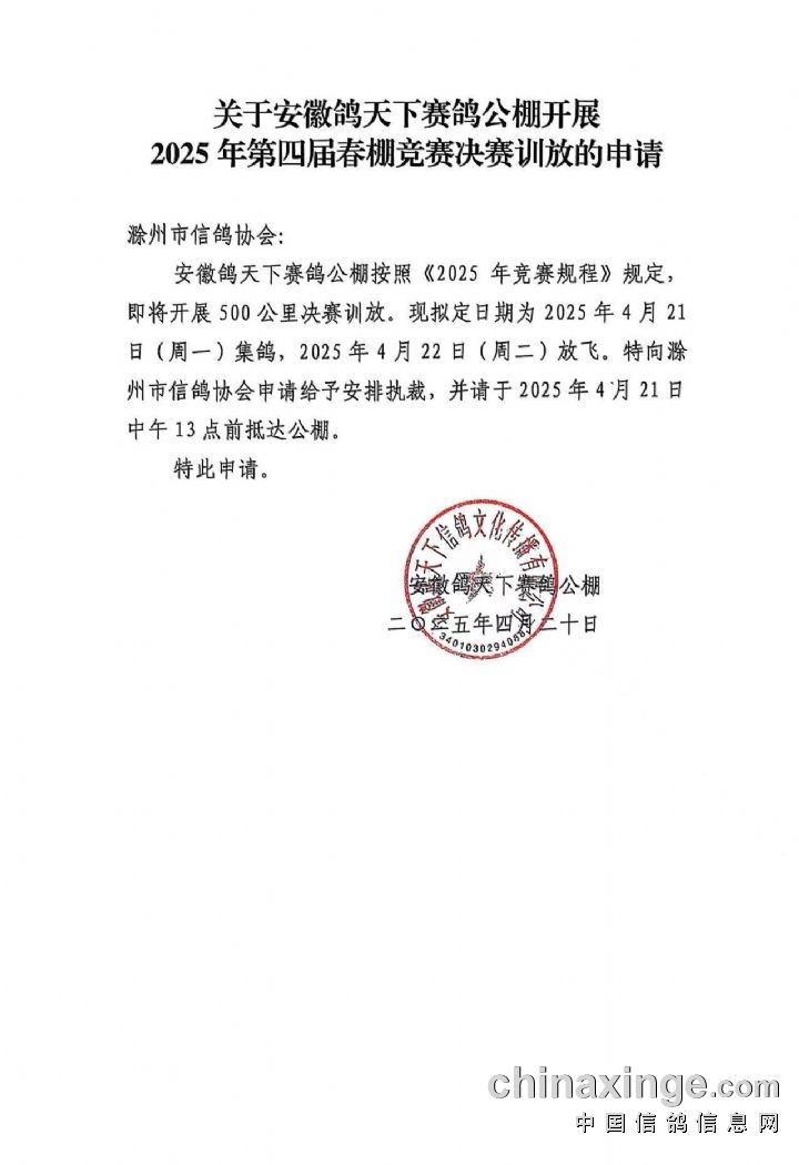 安徽鸽天下赛鸽公棚定于4月21日晚上集鸽,进行500公里决赛训放。