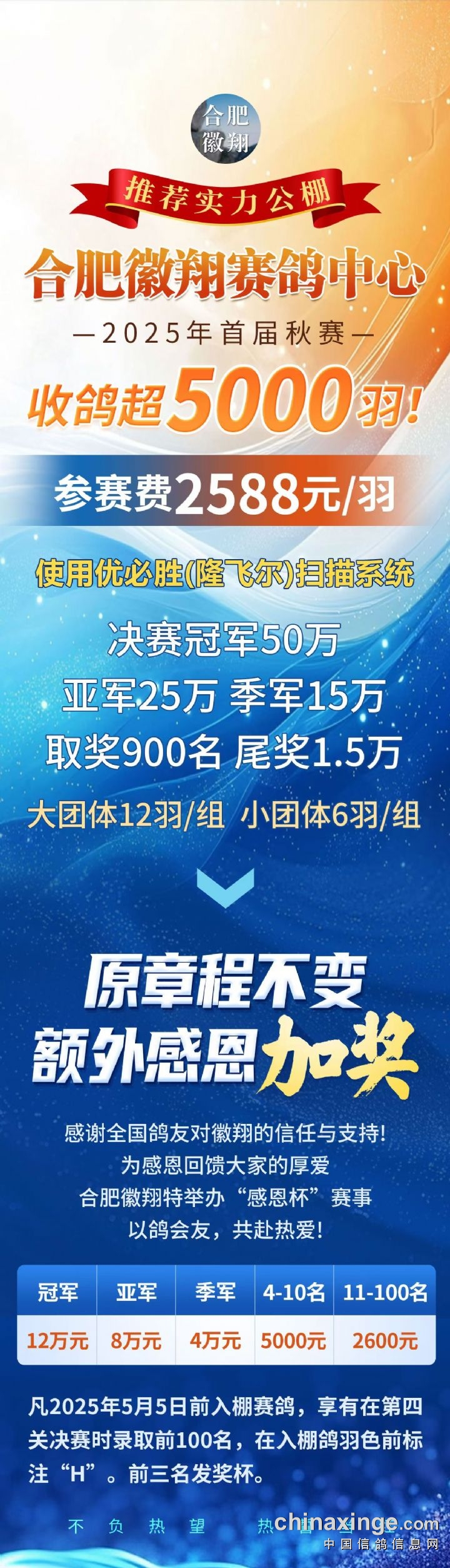 感谢各位老师的支持与信任!徽翔赛鸽中心秉承着公平,公正,公开的初心,聚力打造安徽公棚标杆,纸短情长 不负所托!徽翔团队定全力以赴,为每羽赛鸽的荣耀护航!