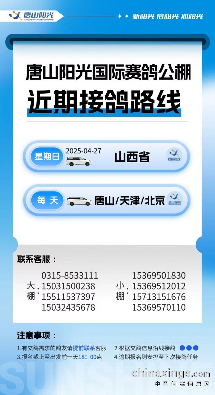 尊敬的会员您好,唐山阳光公棚近期接鸽路线安排:4月27日山西省。唐山、北京、天津每日上门接鸽,如需交鸽请您提前联系客服!