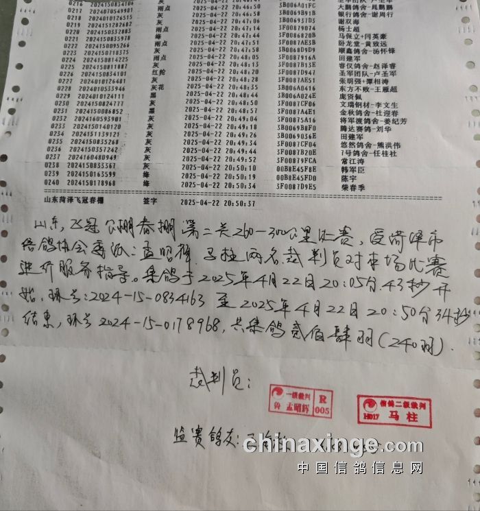 山东飞冠公棚300公里第二关集鸽清单