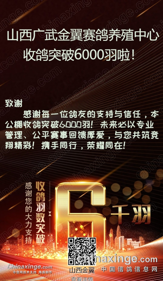 感谢每一位鸽友的支持与信任,本公棚收鸽突破6000羽!未来必以专业管理、公平赛事回馈厚爱,与您共筑竞翔精彩!携手同行,荣耀同在!