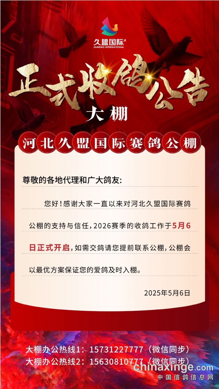 河北久盟国际赛鸽公棚(春棚)正式收鸽公告