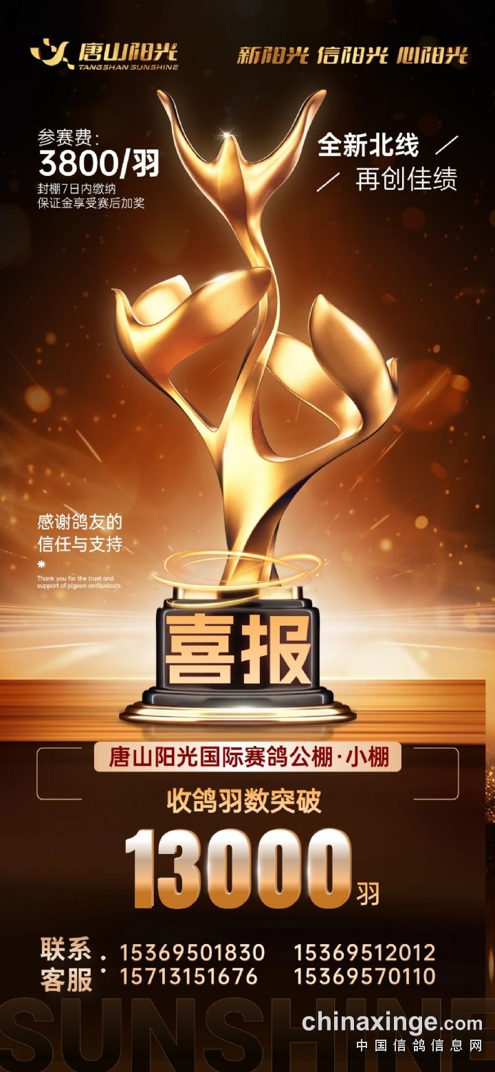 喜报:唐山阳光国际赛鸽公棚(小棚)截止到5月17日收鸽突破13000羽!!!非常感谢全国鸽友及代理的支持与信任收鸽火热进行中.....
