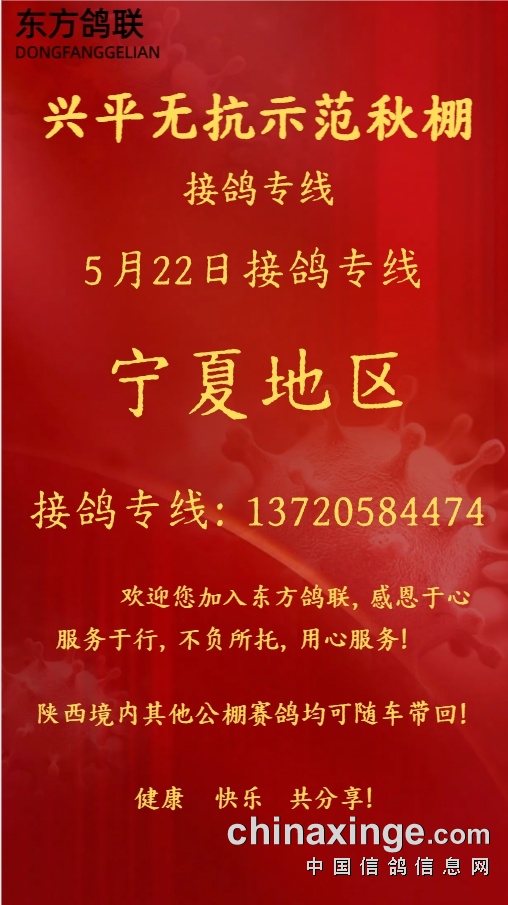 东方鸽联兴平无抗示范秋棚:5月22日宁夏接鸽专线