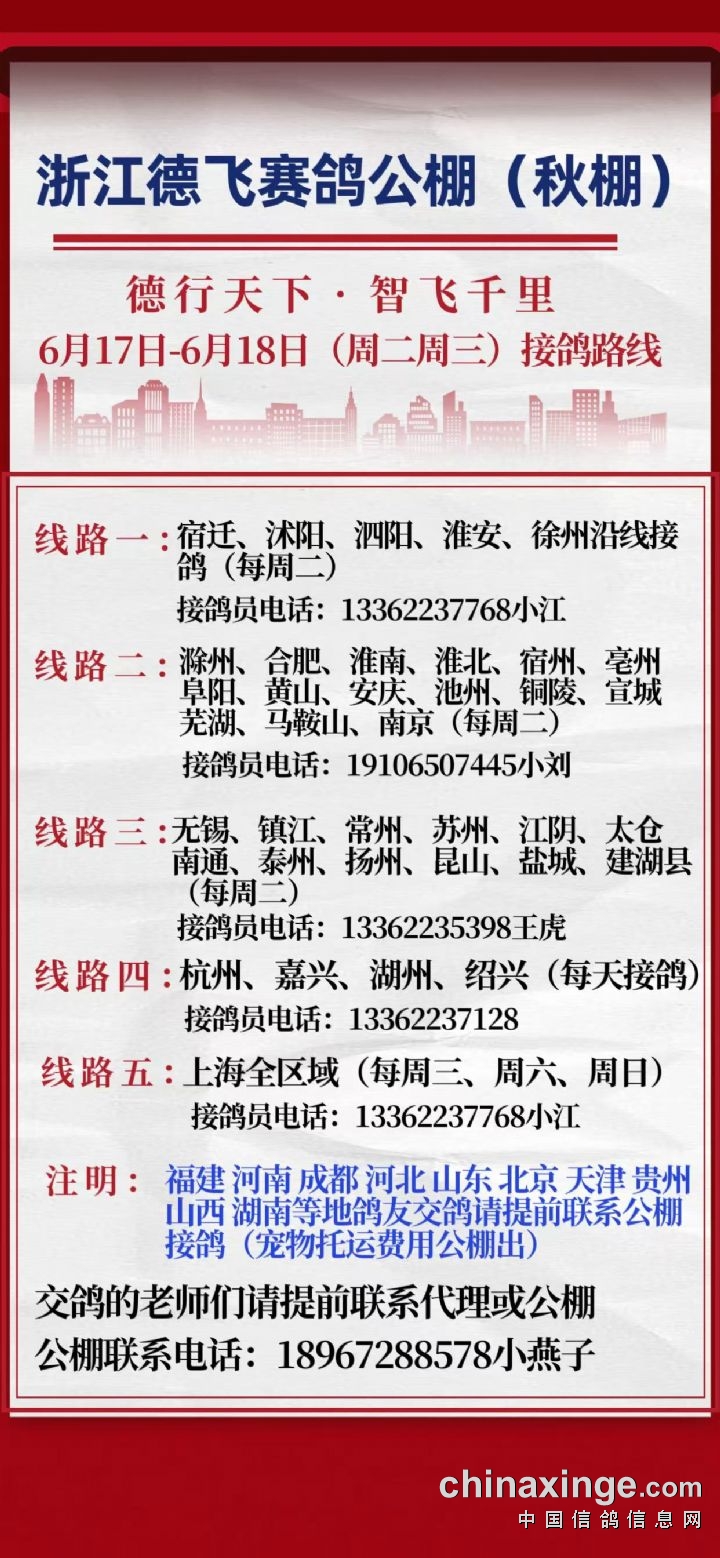 浙江德飞赛鸽公棚(秋棚)接鸽公告(6月17-6月18)