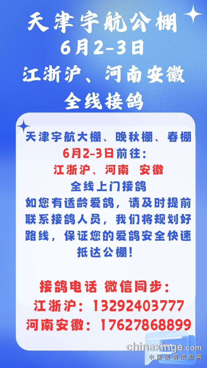 天津宇航公棚6月2-3日前往江浙沪、安徽河南全线上门接鸽