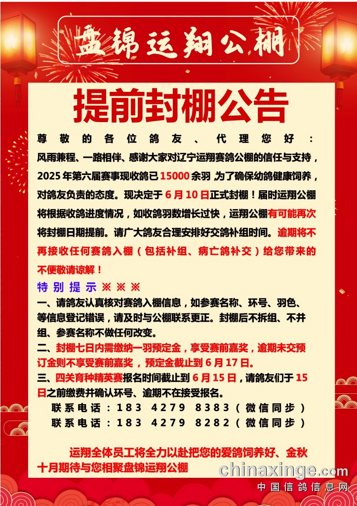 盘锦运翔赛鸽公棚2025年提前封棚公告
