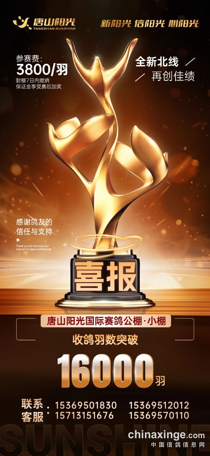喜报:唐山阳光国际赛鸽公棚(小棚)截止到6月1日收鸽突破16000羽!!!非常感谢全国鸽友及代理的支持与信任收鸽火热进行中.....