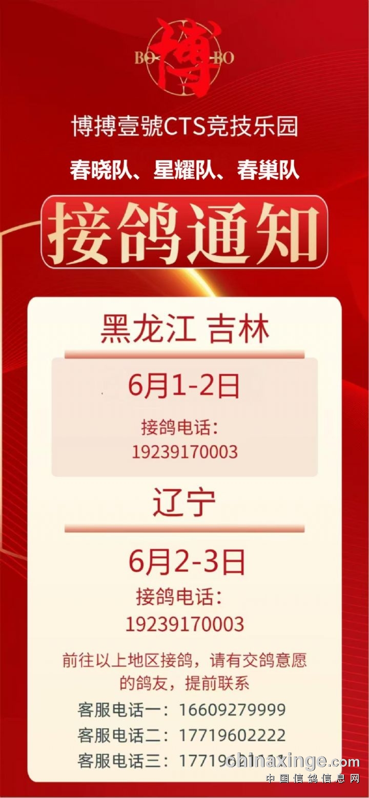 博搏壹號春晓队黑龙江,吉林6月1日-2日,辽宁6月2日-3日接鸽公告