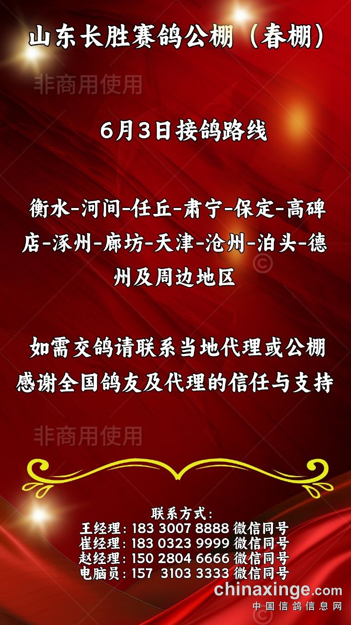 山东长胜赛鸽公棚(春棚)6月3日接鸽路线