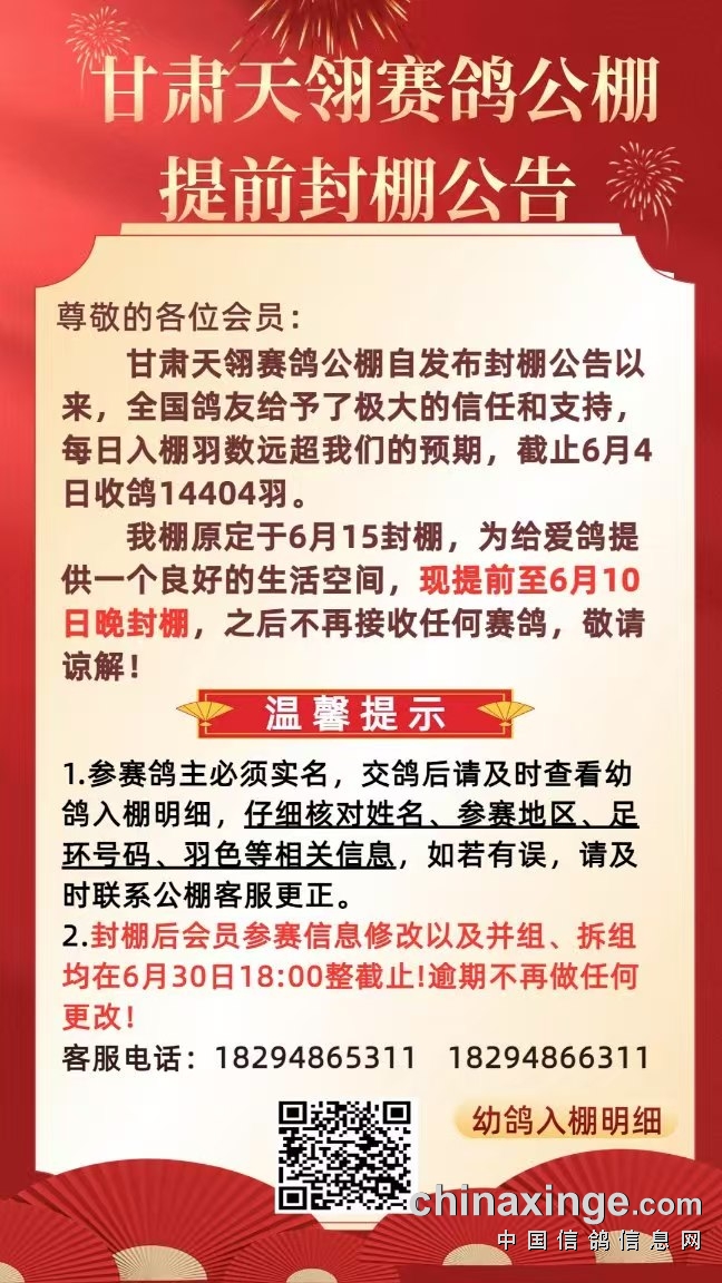 甘肃天翎赛鸽公棚2025年提前封棚公告
