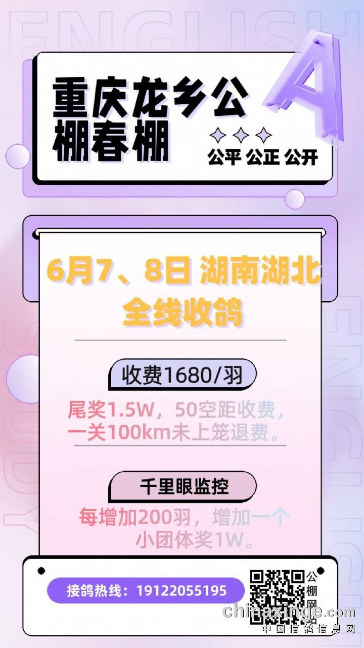 重庆龙乡信鸽公棚(春棚)6月7日-8日湖南、湖北全线接鸽