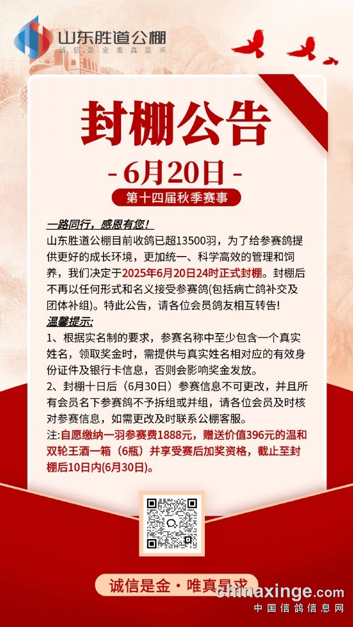 • 山东胜道公棚2025年第一关开笼公告及直播网址 (2025-11-19 8:58:31)